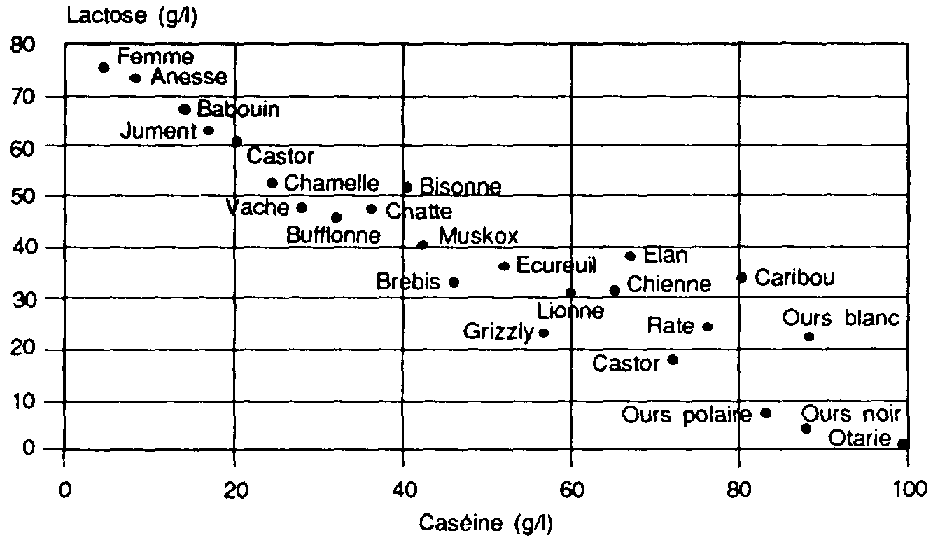 FIGURE 5 Relation entre teneur lactée de lactose et graisses dans différentes espèces de mammifères