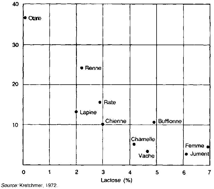 La croissance du nourrisson est plus lente que celle des autres mammifères, ce qui permet de comprendre que les laits de ces derniers soient plus riches en protéines et en minéraux (en calcium notamment). Ces laits ont par ailleurs moins de lactose et des concentrations assez variables en matières grasses. C'est surtout cette dernière teneur qui conditionne leur pouvoir énergétique, qui oscille entre 450 kcal/litre (jument, ânesse) et 2 500 kcal/ litre (renne). Il existe une relation linéaire entre teneur en caséine et en lactose du lait (voir figure 4). Une relation semblable existe également entre teneur en lactose et en matières grasses (figure 5). Cela peut encore être exprimé comme suit: la somme des teneurs en protéines et en lactose des laits est relativement constante (de 75 à 90 g/litre).