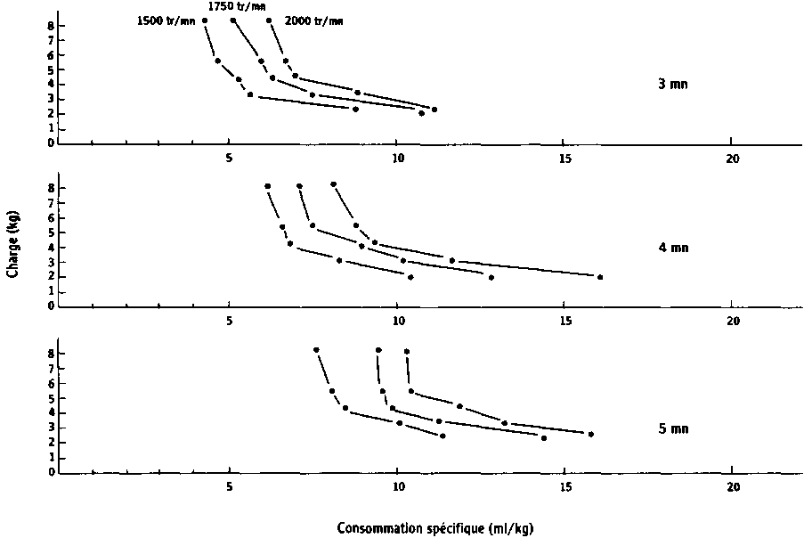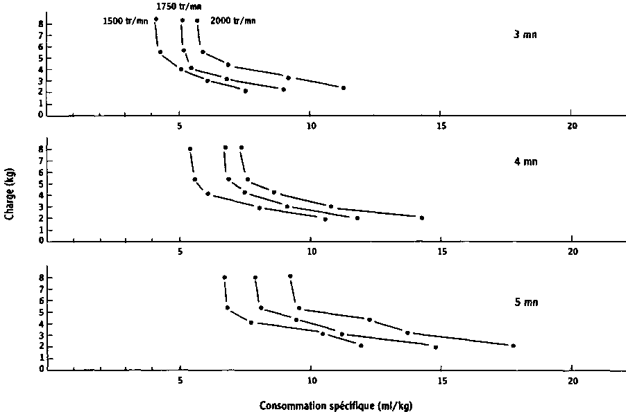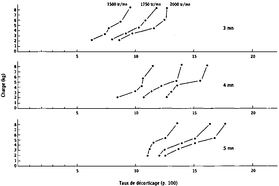 En faisant varier la vitesse de rotation des organes abrasifs, la quantité de grains dans la chambre et le temps de décorticage, on a obtenu les résultats ci-après (figs 1-4):