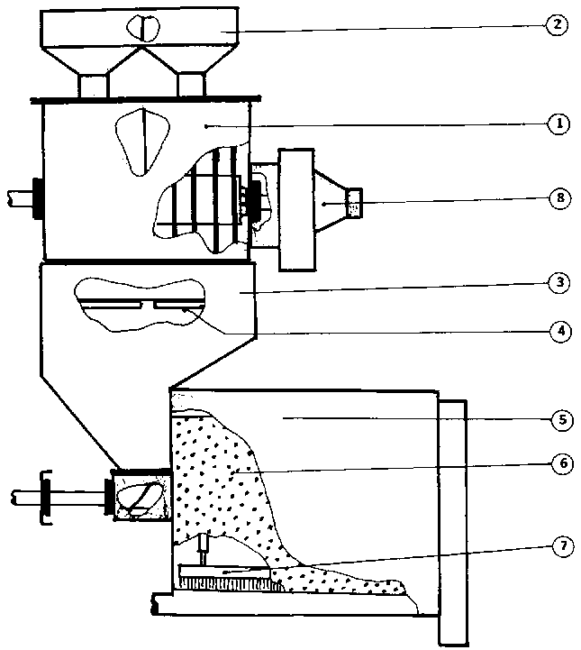 L'analyse du processus complet de transformation primaire a montré que même le grain décortiqué à sec est toujours humidifié par lavage et ressuyage avant la mouture. Cette humidification est faite d'une part pour faciliter la mouture et la granulation, d'autre part pour déclencher la fermentation (cf. chap. l). Au cours de ce lavage, tout le son résiduel est éliminé. Il n'est donc pas nécessaire d'éliminer tout le son lors du décorticage au niveau de ces minoteries de services. A partir de cet important constat, il a été procédé à une ultérieure modification de modèle précédent en supprimant le séparateur et en aspirant le son au niveau de la goulotte de descente du produit décortiqué (fig. 7). Ce faisant, on récupère environ 90 p. 100 du son, les 10 p. 100 restants étant éliminés lors du lavage. Le débit de ce modèle peut varier de 150 à 250 kg/heure, ceci en fonction de l'importance des apports individuels et du niveau de compétence technique et de gestion du meunier.
