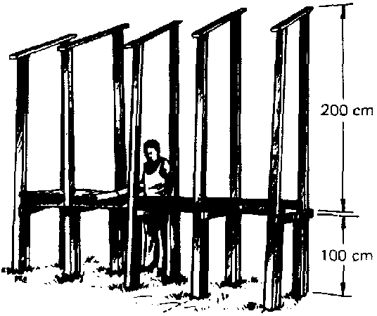 Enfoncez un poteau en forme de 'Y' dans chacun des 8 trous À l'éxterieur de chaque poteau placez un montant vertical, les plus courts d'un côté, les plus longs de l'autre. Remplissez de terre et tassez.