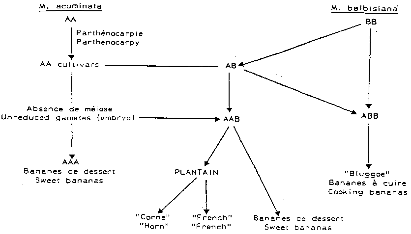 Au plan biologique, la banane doit aussi être distinguée du plantain. La classification des bananiers est basse sur l'hypothèse que toutes les bananes comestibles proviennent de deux parents, deux espèces du genre Musa: M. acuminata (AA) et M. balbisiana (BB). Ces deux espèces fertiles se seraient croisées à l'état sauvage. Les lettres A et B désignent la ploidie et la composition du génome chez ces parents (SIMMONDS, 1959), (DE LANGHE, 1976), (ROME, 1976). L'absence de méiose au niveau des gamètes femelles a provoqué la formation de triploides AAA (banane de dessert), AAB, ABB, et méme de têtraploides (figure 1) (CHAMPION, 1976).