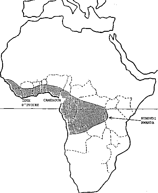 Figure 4: Zones de production du plantain en Afrique Centrale et de l'Ouest (d'apès INIBAP, 1988)