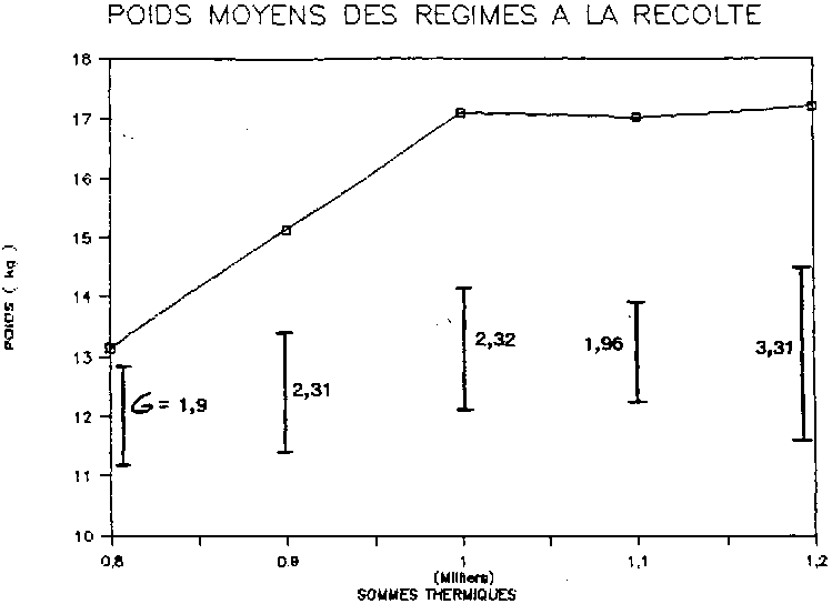 On récolte plusieurs lots de régimes en se basant sur les sommes thermiques hebdomadaires depuis la floraison: on choisit un stade moyen de récolte qui correspond à une somme de 900°C (référence de récolte de la banane dessert), et on fait varier les autres stades de coupe de part et d'autre de cette moyenne.