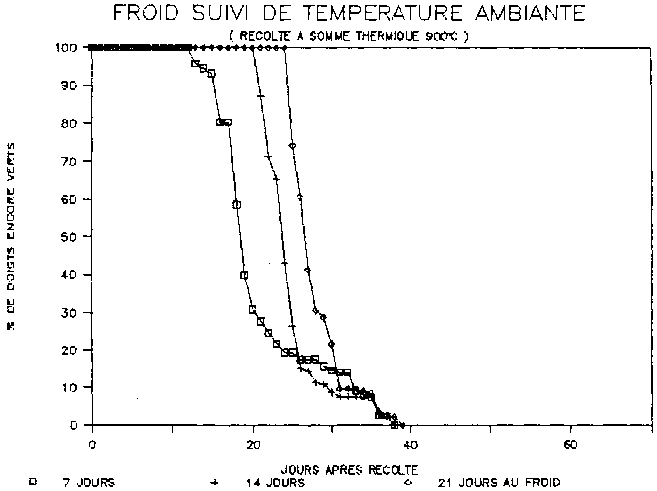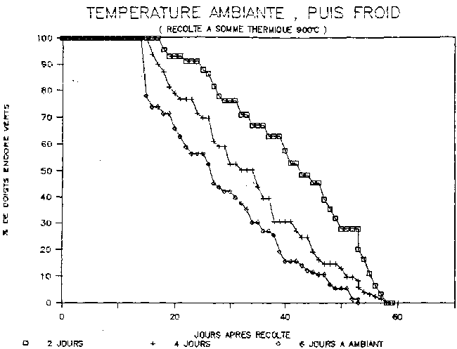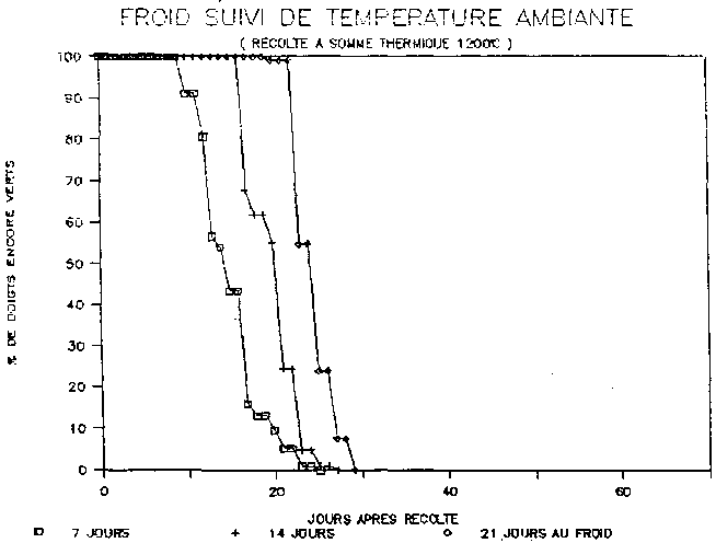 On procède comme en II.1. (prélèvement compris) mais une partie des caisses de chaque traitement "CHAMBRE FROIDE" est placée immédiatement dans celle-ci. Tous les doigts sont traités par un fongicide L'autre partie est divisée en 3 lots placés respectivement pendant 2, 4, 6 jours à température ambiante avant d'étre introduits en chambre froide.