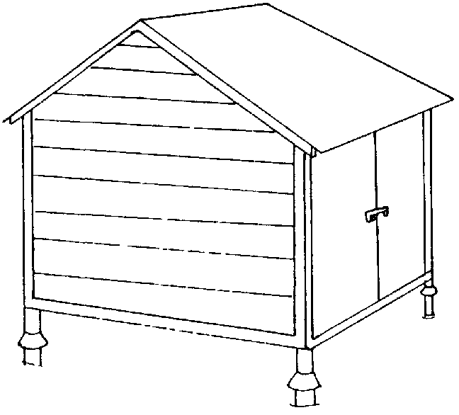 Edificios a prueba de roedores. En el caso de un depósito de madera, debe elevarse el piso de modo que quede como mínimo a unos 80 cm por encima del suelo. Alrededor de los pilares se deben colocar barreras contra ratones para impedir que trepen por ellos (figura 62). En un almacén tradicional es necesario cubrir las paredes externas con argamasa de cemento liso hasta unos 60 cm de altura, y procurar que las puertas y ventanas ajusten perfectamente (figura 63).