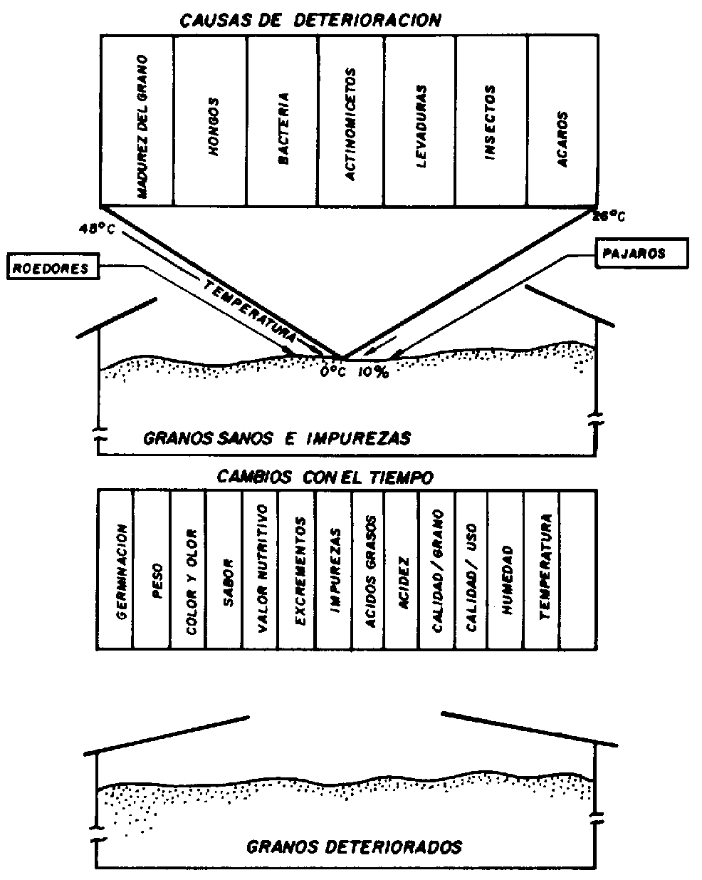 El deterioro de los granos almacenados es, en cierta forma, un proceso complejo. Normalmente es un proceso lento y al principio poco perceptible. Sin embargo, puede ser rápido si las variables que influyen en el mismo están correctamente combinadas; esto es, si las variables físicas, químicas y biológicas son favorables a la actividad biológica del grano y de los otros organismos vivos que habitan en el medio ecológico creado en la masa de granos.