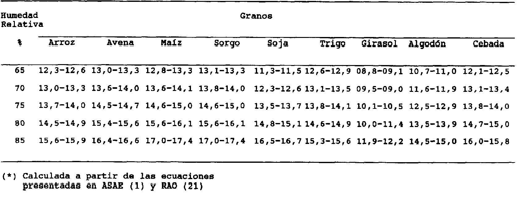 Como se muestra en el cuadro I, el comportamiento de cada especie de granos es diferente en relación a los valores de la actividad del agua para un determinado contenido de humedad y temperatura del grano. Por ejemplo, el maíz una actividad de agua igual a 0,621 para una temperatura de 30° y contenido de humedad de 12,5. Para ese mismo contenido de humedad, la actividad del agua de la soja es 0,720. En el primer caso, para el maíz la actividad del agua asegura la estabilidad del producto durante el almacenamiento; en el segundo caso, para la saja, el producto no está en condiciones de almacenarse por un período de tiempo largo. El análisis de la actividad del agua es el factor más importante para establecer los contenidos de humedad recomendados para el almacenamiento seguro de los granos.