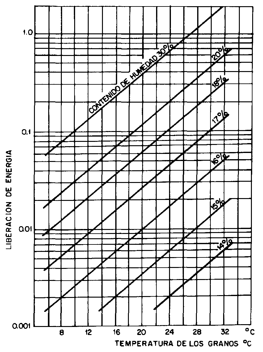 El comportamiento de los granos durante su almacenamiento está influenciado por las condiciones climáticas existentes durante su crecimiento, por el grado de maduración durante la cosecha, por el método de cosecha y por la manipulación que sufrió el producto antes del almacenamiento. Así, cuanto mayores son los daños sufridos por el producto desde su producción hasta el momento del almacenamiento, más susceptible estará a los agentes que causan el deterioro. Los granos sanos presentan tasas de respiración menores que aquellos que sufren daños. La figura 7 muestra un gráfico que relaciona la temperatura, el contenido de humedad y la tasa de respiración de los granos de trigo.