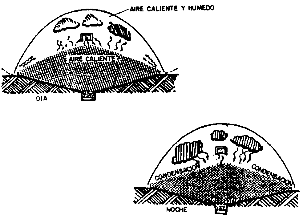 El calentamiento diurno de la lamina de la pared del techo de los silos metálicos hace que la temperatura del aire, en el espacio intergranular próximo a la pared, suba. Lo mismo pasa con el aire que está sobre la capa superior de los granos. El aire caliente tiene mayor capacidad de mantener vapor de agua, y como éste está en contacto con el grano, la humedad del grano se evapora y el aire queda, por lo tanto, caliente y húmedo. Con la disminución de la temperatura durante la noche, la temperatura del aire en esos espacios también irá disminuyendo hasta alcanzar temperaturas bajo el punto de rocío, ocurriendo entonces la condensación de la humedad. La posibilidad de que el aire se condense en los silos de concreto es menor que en los silos metálicos.