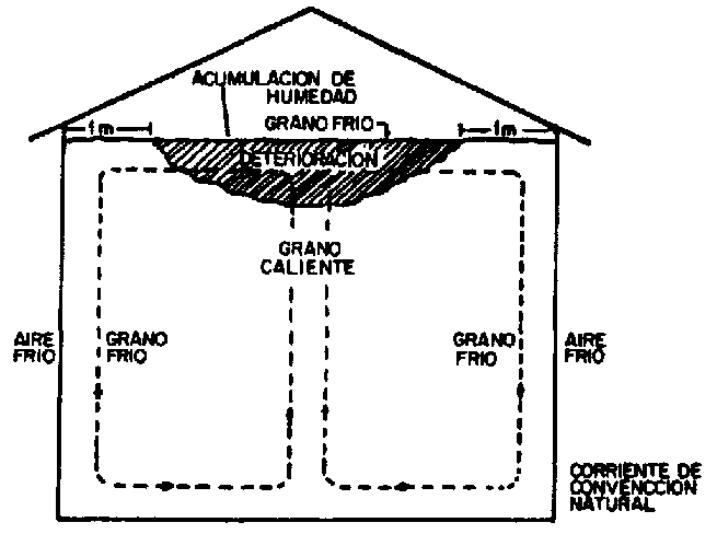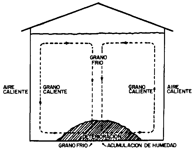 Los granos generalmente se almacenan a temperaturas relativamente altas, en comparación con las bajas temperaturas ambientales que pueden ocurrir, por ejemplo en una reglón en que el invierno es riguroso. De esa forma, si la temperatura ambiental es menor, los granos que están próximos a las paredes y a la parte superior de los silos metálicos tendrán una temperatura menor que la del interior de la masa y por lo tanto, existen condiciones para el establecimiento de corrientes de aire movido por convección natural.