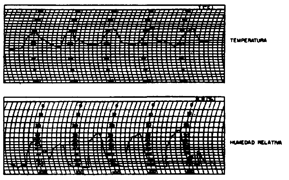 La humedad relativa del aire varía con las horas del día. Normalmente es mas elevada durante la noche que durante el día como resultado de las variaciones de la temperatura del ambiente. Esa variación diaria de la humedad relativa y de la temperatura tienen un comportamiento similar al que se representa en la figura 13, en la que se advierte que al elevarse la temperatura, la humedad relativa desciende y viceversa.