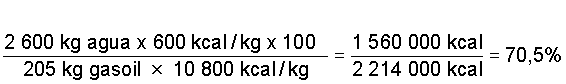 Si el consumo de gasoil medido fuera, por ejemplo, de 260 l/hora, para un gasoil de 0,820 kg por litro, serán 213 kg de gasoil/hora. Si este gasoil tiene un poder calórico de 10 100 kcal/kg, el consumo energético será de: