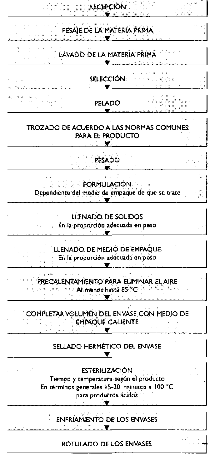 Algunos ejemplos de conservas son las frutas trozadas en almíbar las hortalizas en salmuera, las hortalizas en vinagre aromatizado (encurtidos), las salsas y las hortalizas en aceite. La Figura 1 muestra el diagrama de flujos general para conservas.
