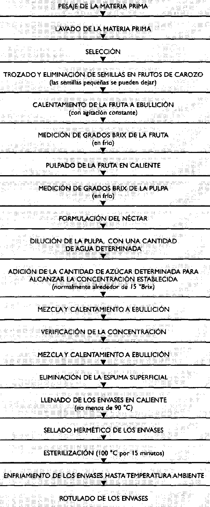 El envasado de un néctar habitualmente se realiza en una botella de vidrio, la cual se esteriliza una vez que se ha llenado en caliente con el producto. La Figura 3 muestra el diagrama general de flujos para la elaboración de un néctar.