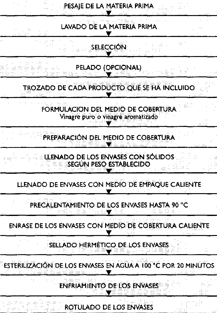 En la Figura 5 se observa el diagrama general de flujos para la elaboración de encurtidos por adición de ácido al medio de cobertura. El proceso de fermentación puede ser revisado como parte del proceso de capacitación, pero resulta poco práctico para la elaboración de productos durante las sesiones de aplicación por la imposibilidad de realizarlo en plazo breve.