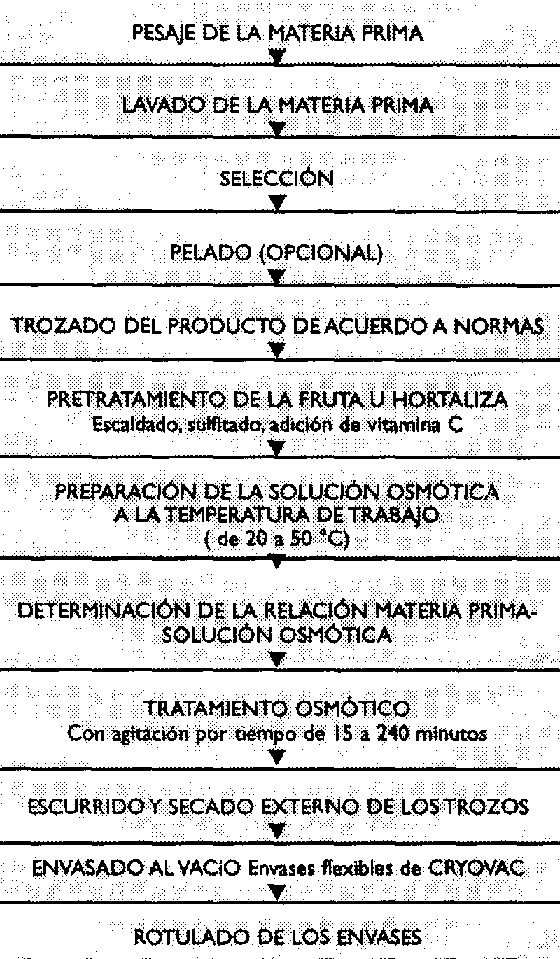 Este es un proceso de deshidratación determinado por fenómenos de transporte, de difusión en medio líquido. Se trata de extraer parcialmente el agua de un producto mediante el uso de la fuerza osmótica aportada por una solución concentrada de solutos diversos. La alta concentración del medio debe promover el transporte de agua desde el producto debido al gradiente de presión osmótica existente y al gradiente de concentración de agua entre producto y medio.
