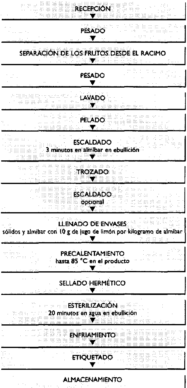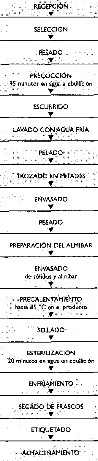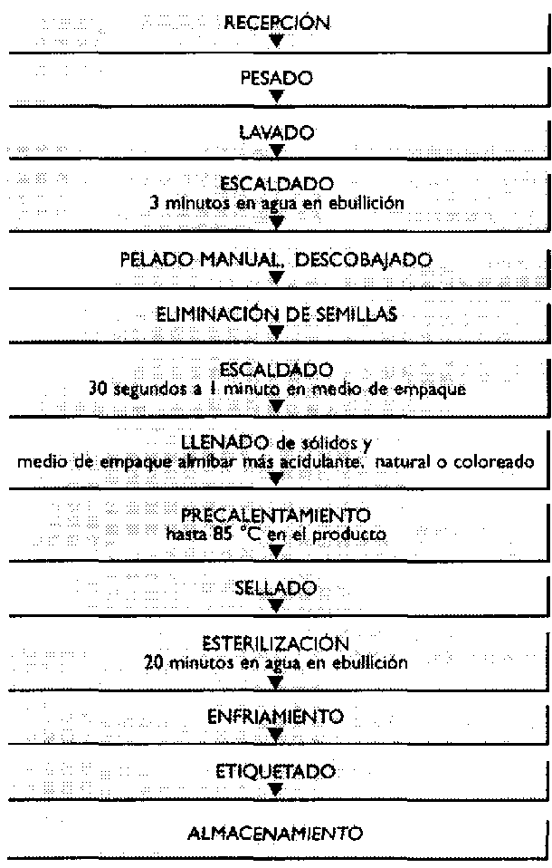 Por esta razón, se puede preparar un producto escaldado antes de pelar y, luego, eliminar las semillas en algunos de ellos. Luego se prepara almíbar natural y los frutos escaldados se colocan directamente en el almíbar caliente; se precalientan con los envases abiertos para eliminar el aire aún presente en la fruta y el almíbar y se cierra herméticamente el envase para su esterilización por 20 mio a 100 grados centígrados.