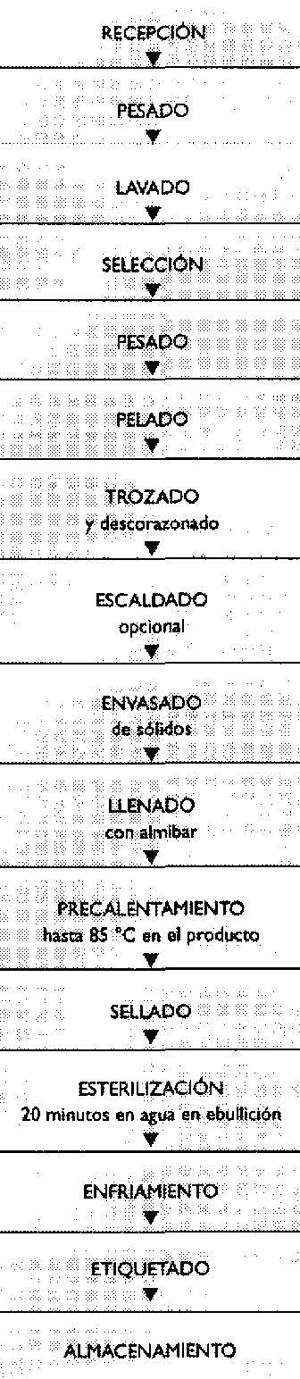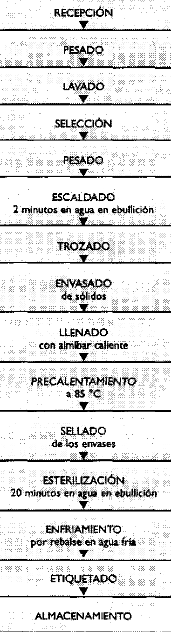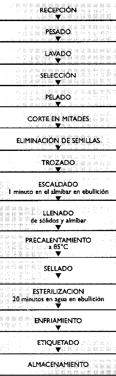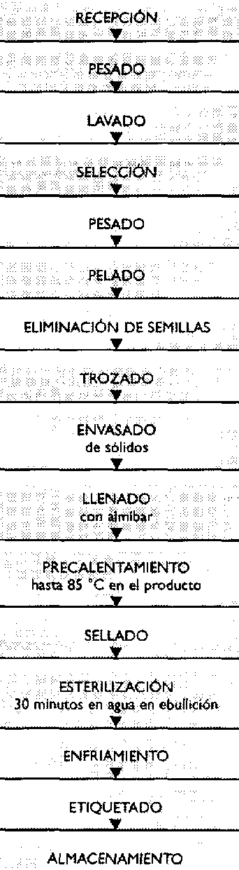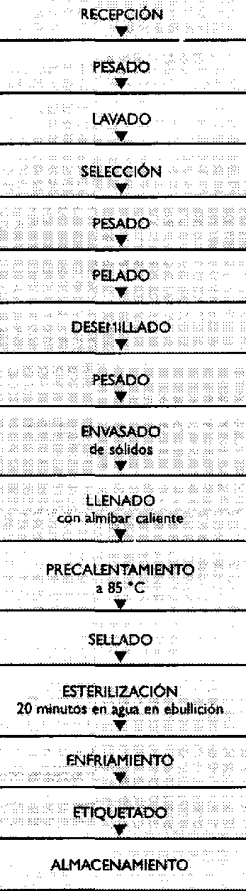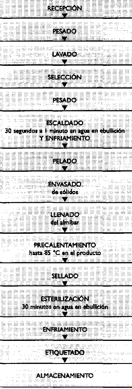 NOTA: Se debe cuidar que el peso de fruta en el envase debe determinarse con fruta escaldada, porque de otro modo el envase de vidrio se verá vacío una vez que se haya precalentado y esterilizado. Se recomienda que el peso de fruta sea determinado en cinco envases para obtener un promedio para los cálculos.