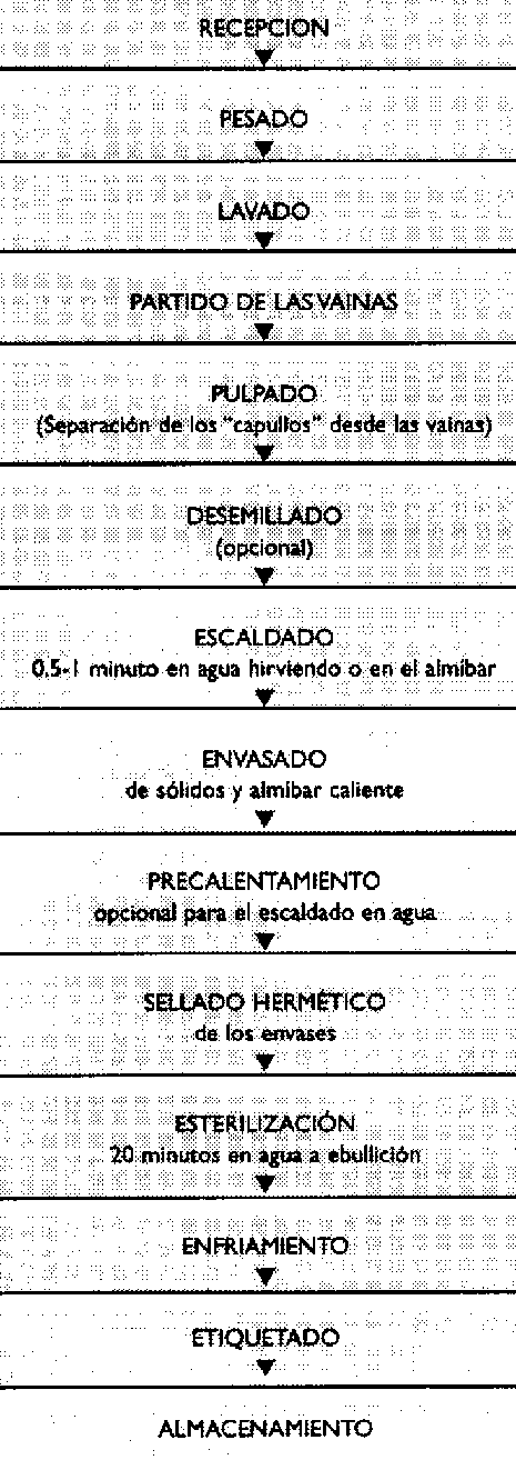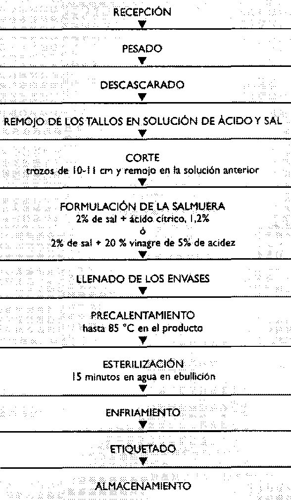 Luego se despuntan, se trozan en cortes de aproximadamente 2,5 cm y se lavan y se vuelven a pesar. Se escaldan por 3 mio en agua en ebullición (100 °C), se enfrían en agua corriente y se procede a llenar los envases.