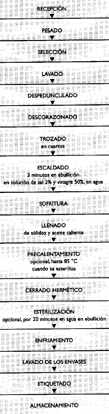 Los frutos se despedunculan, se descorazonan y se trozan en cuartos u octavos, y se someten a un escaldado en una solución de agua con un 50% de vinagre y un 2% de sal.