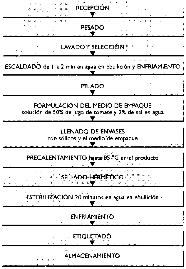 Los tomates se recepcionan, se lavan, se seleccionan, se escaldan y enfrían para pelarlos más fácilmente. Se debe hacer la prueba de pelado como en el caso del tomate de árbol.