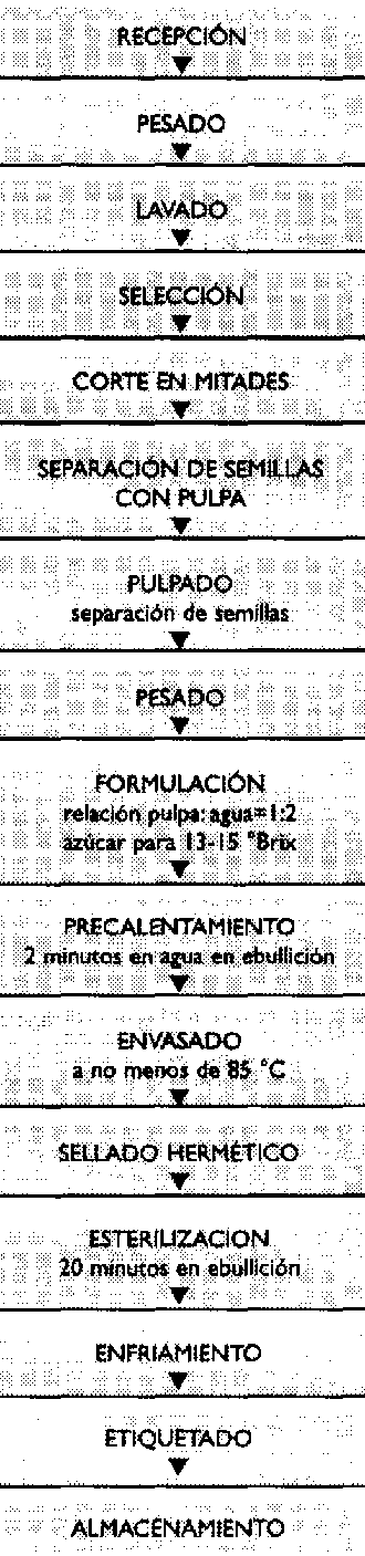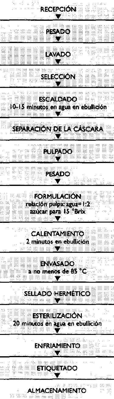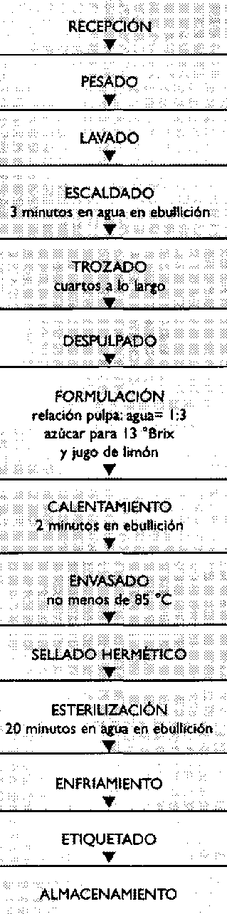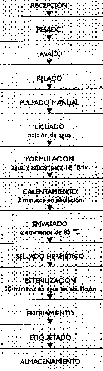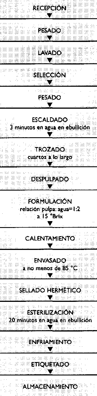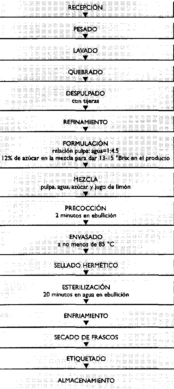La mezcla, como siempre, se somete a un calentamiento en ebullición y se envasa en caliente, se sella herméticamente y se esteriliza. Luego de enfriar, se secan los envases y se etiquetan. En la Figura 53 se muestra el diagrama de flujo para el proceso. Algunas operaciones de este proceso se pueden apreciar en las fotografías 206 a 209.