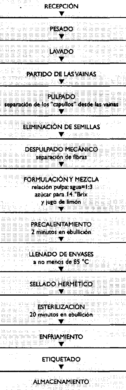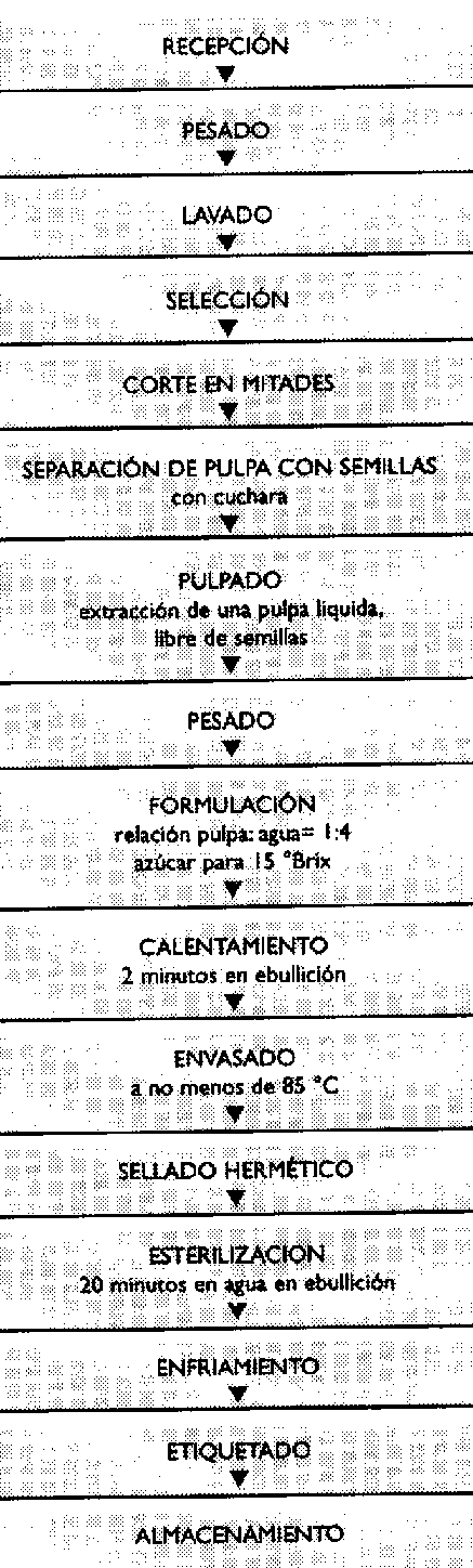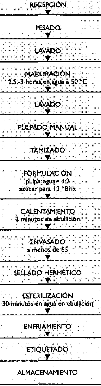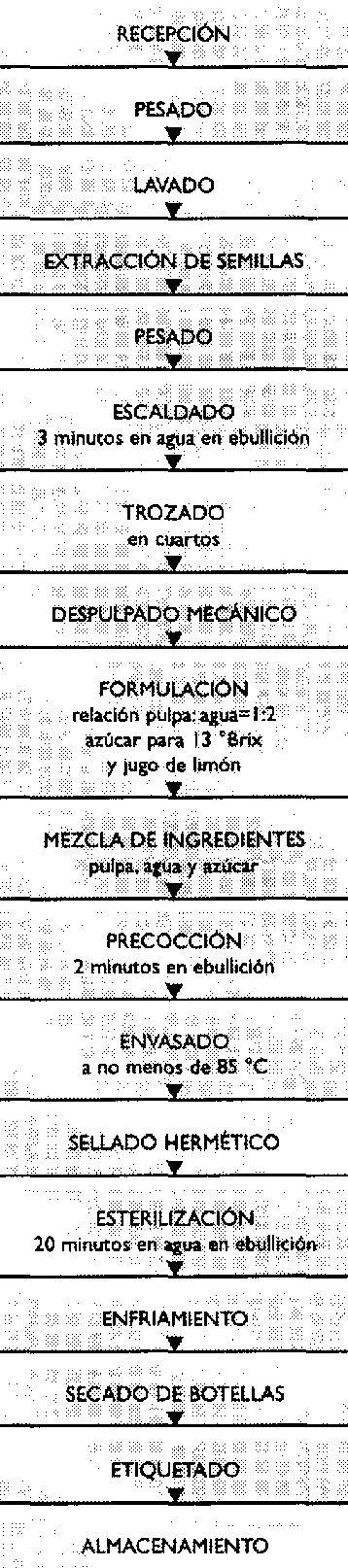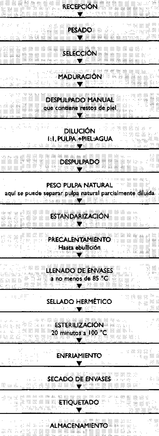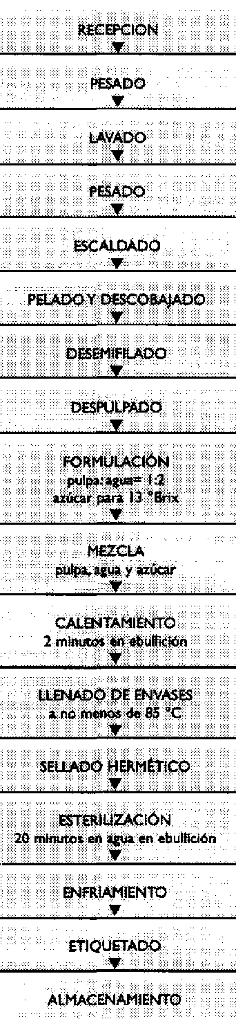 La mezcla, como siempre, se somete a un calentamiento en ebullición y se envasa en caliente, se sella herméticamente y se esteriliza. Luego de enfriar, se secan los envases y se etiquetan. En la Figura 53 se muestra el diagrama de flujo para el proceso. Algunas operaciones de este proceso se pueden apreciar en las fotografías 206 a 209.