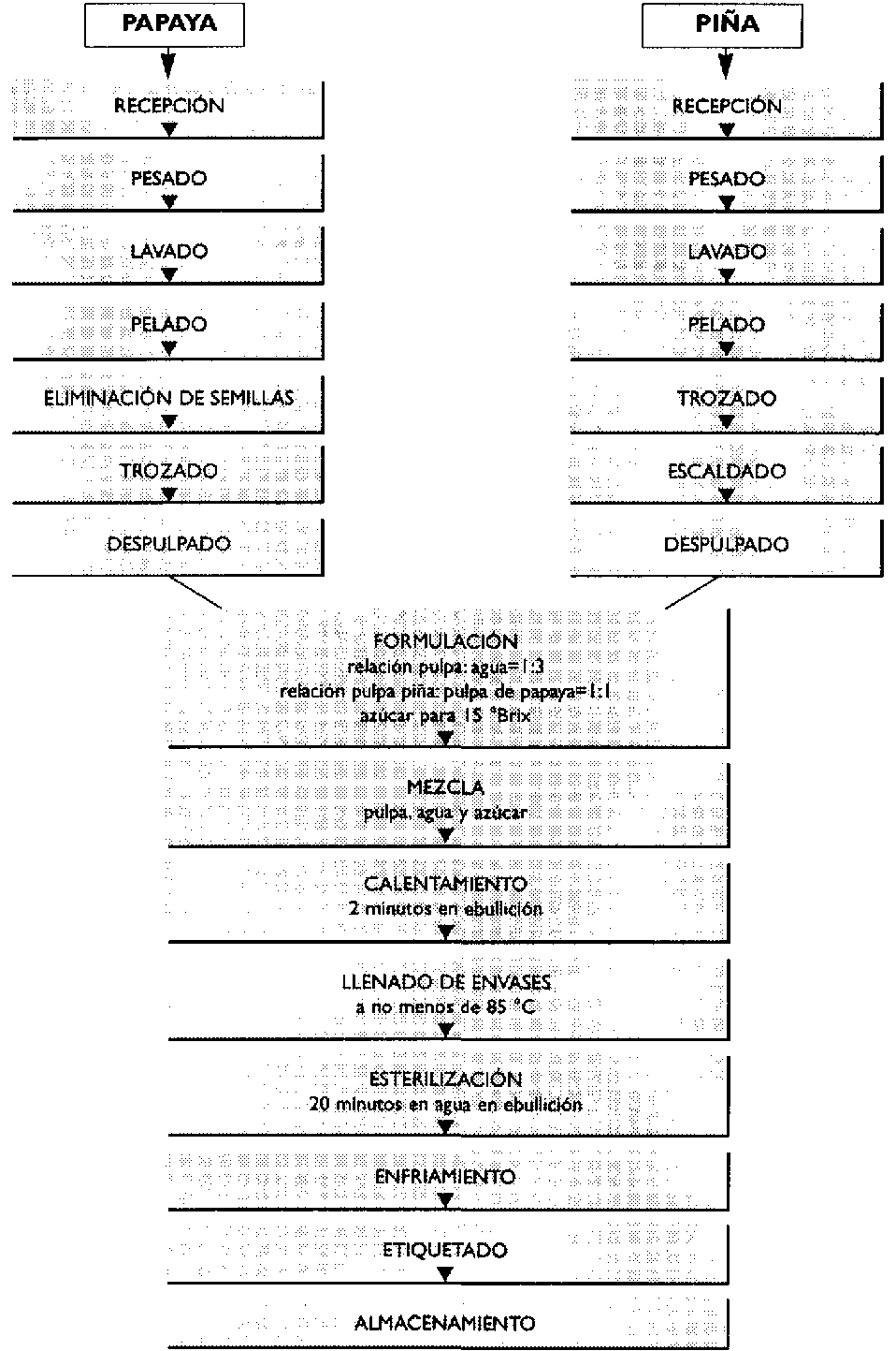 La papaya se corta en trozos pequeños y se despulpa directamente. La piña requiere una cocción para ablandarla y aumentar el rendimiento en pulpa para el néctar. Los trozos se calientan por 15 mio en un poco de agua en ebullición, la que después deberá incorporarse al néctar. La parte central de la piña, "el corazón", debe calentarse por 25 minutos. Luego se mezclan la pulpa de piña con la de la papaya en partes iguales.