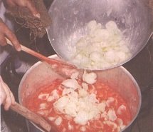 Adición de ajos y cebollas sofritos a la mezcla de tomate y zanahoria (G. Paltrinieri)