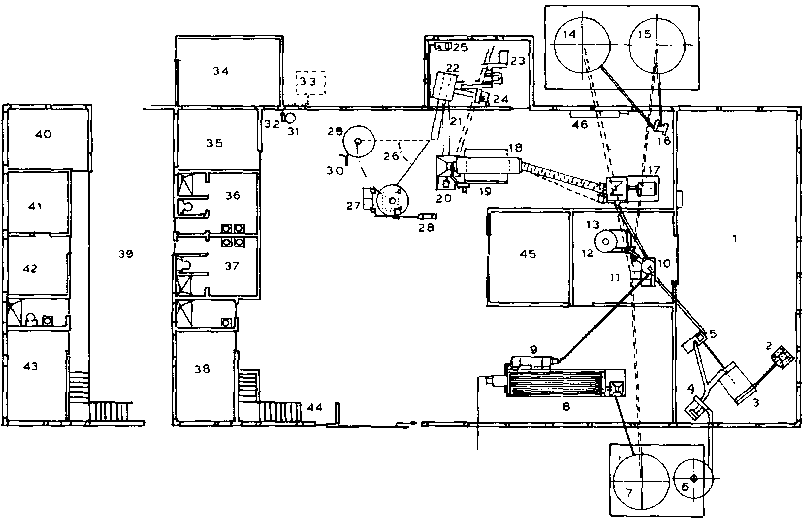 205. Un bloc-diagramme typique d'une unité de transformation par extrusion est donné Fig. 31. Les différents éléments montrés Fig. 31, tels qu'ils ont été adaptés par la "National Milling Corporation", sont donnés dans le plan de masse Fig. 32. Ce plan d'installation n'est pas unique, mais il a été conçu pour s'intégrer dans un bâtiment pré-existant qui a été transformé. Le plan d'une installation pilote d'extrusion "bon marché" plus élaborée est donné Fig. 33. Il comprend tous les éléments de l'installation LISHA, excepté l'unité de décorticage qui est remplacée, Fig. 33, par une unité plus performante. Le système représenté Fig. 33 constitue un modèle d'installation pilote d'extrusion, conçue à partir de zéro et autonome, qui est indépendante d'infrastructures administratives ou autres.