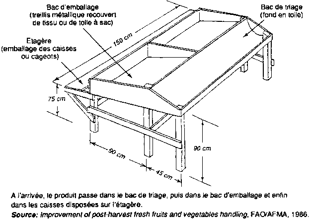 Un dernier contrôle immédiatement avant l'emballage du produit permettra d'éliminer les denrées invendables qui auraient pu échapper au premier tri. Lorsqu'il s'agit de trier à la main de faibles volumes de produits, un simple plan de travail suffit pour assurer le tri, le calibrage et l'emballage (figure 19). Le plan de travail figurant sur l'illustration pourra être exécuté à la longueur désirée, ou doublé si l'on doit faire face à de plus grands volumes de produits.