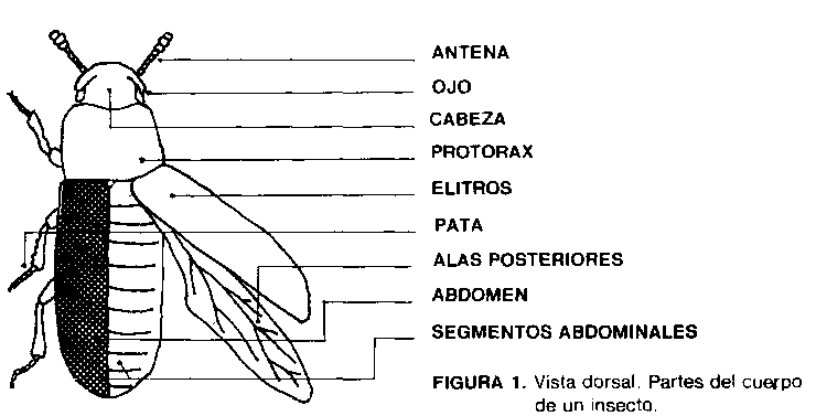 El cuerpo de los insectos se divide en tres partes o tagmas: cabeza, tórax y abdomen que están unidos entre si; los órganos internos se extienden de un extremo al otro del cuerpo. En la cabeza se encuentran localizados el aparato bucal, antenas y ojos. Las alas y patas están en el tórax. El abdomen es segmentado, generalmente sin apéndices salvo en el caso de algunas larvas que poseen falsas patas (Figura 1).