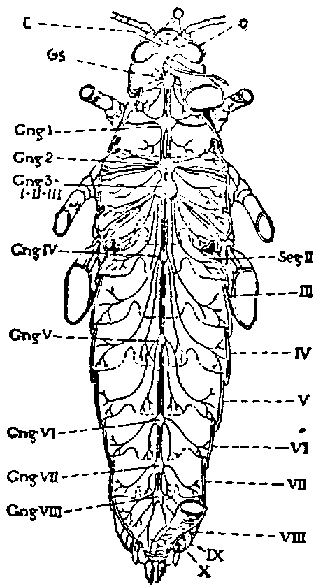 SISTEMA NERVIOSO. El sistema nervioso central esta formado por el "cerebro'' de posición dorsal en la cabeza, seguido por el ganglio subesofágico y una cadena ventral de ganglios unidos por dos cordones nerviosos (Figura 1 8).