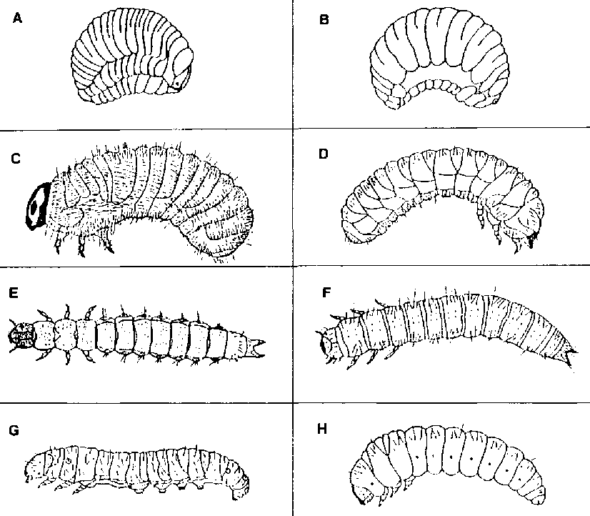 Las larvas de coleópteros pueden ser sin patas (ápodas) o tener patas verdaderas, pero nunca tienen falsas patas. Las larvas de Lepidópteros tienen patas verdaderas y falsas, aunque a voces sólo sean vestigiales; además la mayoría produce lanosidades o sedosidades (Figura 25).