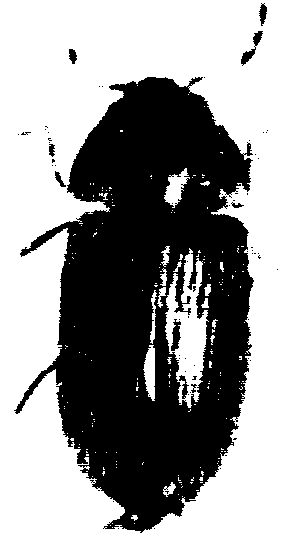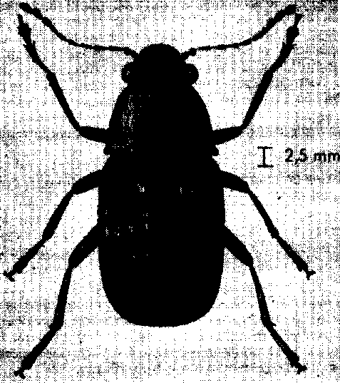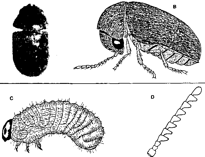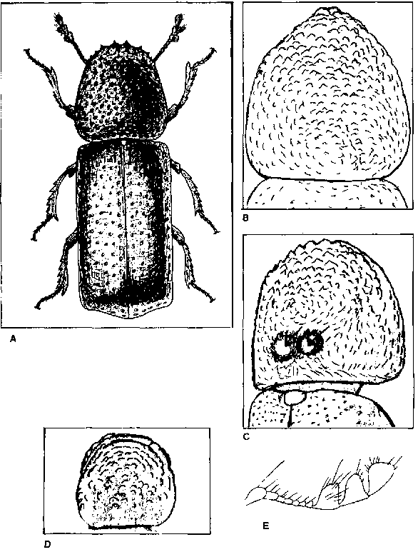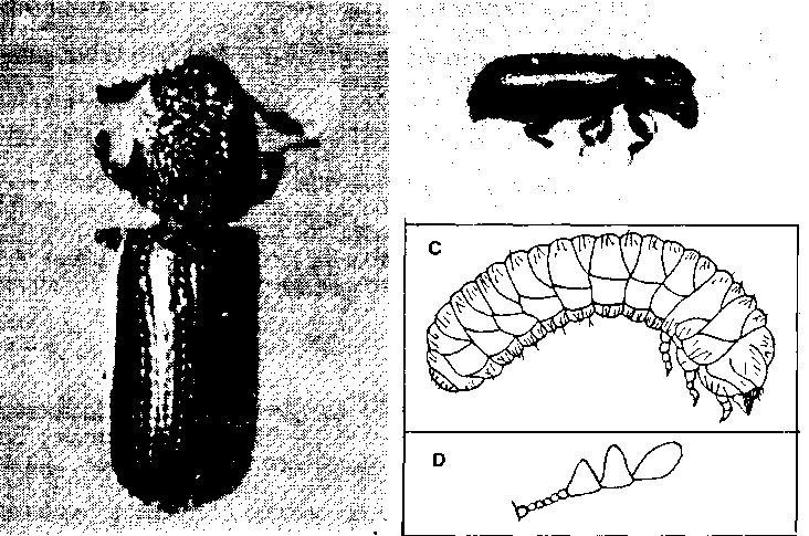 DESCRIPCION. Cuerpo de forma cilíndrica, alargado, con la parte posterior redondeada y ligeramente truncada. Cabeza retráctil dentro del protórax. Antenas cuyos tres últimos segmentos son marcadamente más grandes que los demás. Protórax más o menos circular, rugoso debido a la existencia de pequeñas protuberancias. Capaz de volar. Tiene 2,5 a 3 mm de largo y color castaño a café oscuro. (Figura 34).