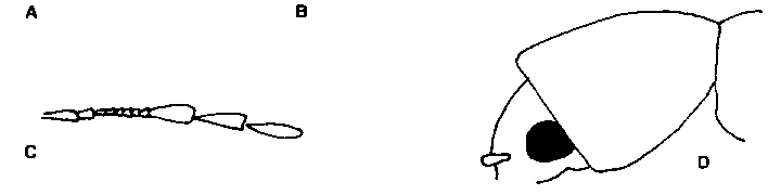 DESCRIPCION: Insecto de 3,5 a 4 mm de longitud, de color azul oscuro, casi negro, cuerpo pubescente, con los segmentos basales de las antenas y las patas de un color amarillo a rojizo; ojos redondeados, dorsalmente claramente visibles y separados por mucho más que el diámetro del ojo; el resto de las antenas de color obscuro o negro, con el último segmento casi igual de largo que de ancho. La parte ventral visible del abdomen de color azul obscuro. (Figura 42).