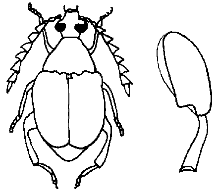 DESCRIPCION: El adulto tiene la cabeza pequeña, con ojos grandes y sallentes, antenas largas y aserradas. Cuerpo ovoidal grueso y cubierto de pelos, mas ancho en la parte posterior. Los élitros son cortos y no cubren completamente la parte posterior del abdomen. Fémur posterior con un diente grande y dos pequeños. Capaz de volar. El adulto es de color pardo, con pequeñas bandas transversales en los élitros, mide 3,5 a 4,5 mm de longitud. (Figura 35).