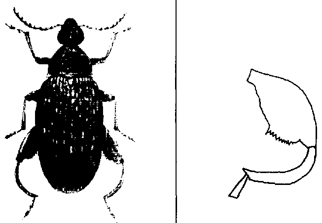 Figura 40. Vista dorsal del gorgojo del maní, Caryedon serratus (Olivier) y de su fémur posterior.