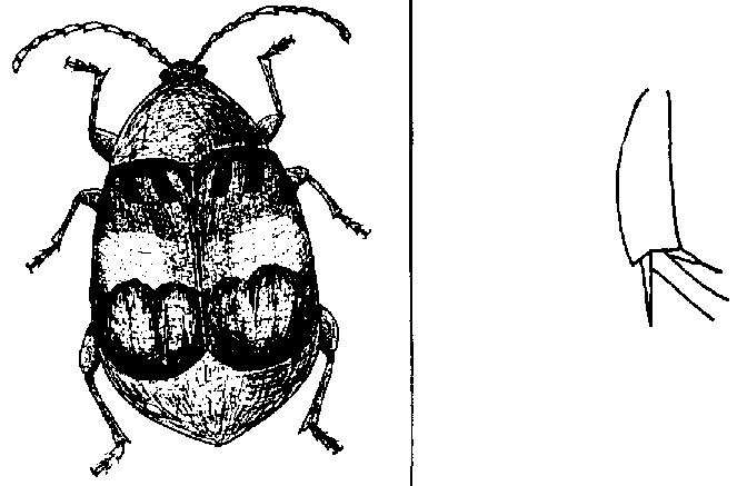 DESCRIPCION: Insecto pequeño de 3 a 4.5 mm de longitud, de cuerpo oval, semicuadro. Los élitros no cubren totalmente el abdomen, con manchas negras visibles en la hembra, mientras que las del macho son de color castaño con manchas negruscas muy pequeñas. Fémur posterior con dos escotaduras en forma de dientes. Antenas largas y aserradas (Figura 39).