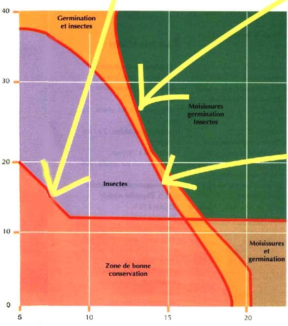 Pour des grains très humides, le risque de développement des moisissures est important et cela quelle que soit la température! A 15 % d'humidité, il est fortement réduit. il en est de même si l'on baisse la température du grain à 20°C