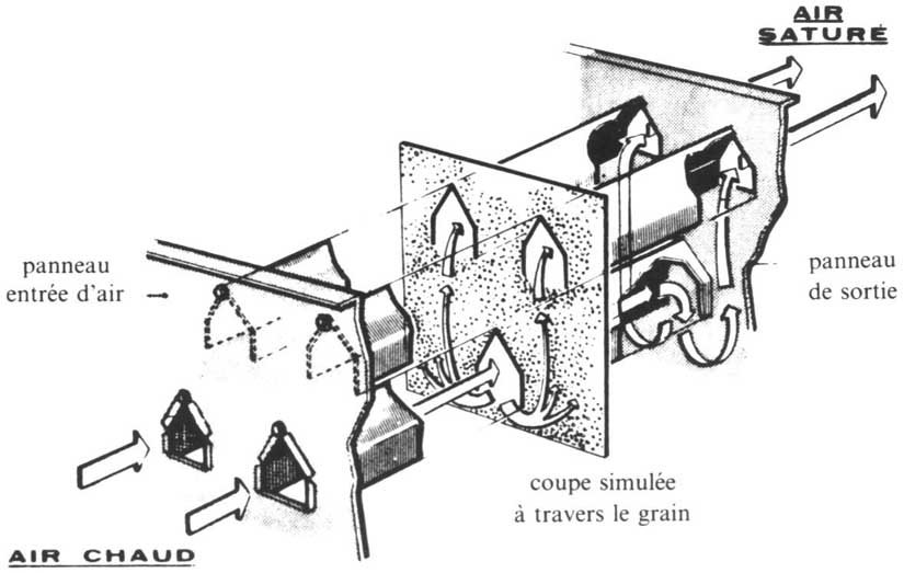 L'air chaud entre dans les gaines à partir d'une chambre de mise en charge latérale. Les gaines sont obturées alternativement côté chambre d'air chaud et côté chambre d'air usé, de sorte que l'air chaud sort par le dessous de la gaine et circule dans le grain jusqu'à ce qu'il atteigne la gaine de l'étage voisin par laquelle il est évacué vers la chambre d'air usé. La longueur du trajet de l'air est de 15 à 20 cm.