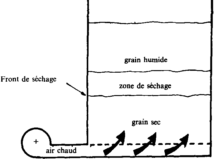 Le grain est disposé en couche généralement horizontale traversée de bas en haut par l'air de séchage. L'épaisseur de la couche peut varier de 30 à 70 cm et correspond à un compromis entre, d'une part le désir d'utiliser au maximum la capacité du séchoir et, d'autre part, l'augmentation de la résistance au passage de l'air avec l'épaisseur qui se traduit par une baisse de débit du ventilateur et ne permet pas d'obtenir le débit spécifique nécessaire pour assurer une bonne homogénéité de séchage.