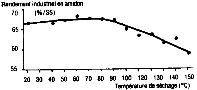 Fïg. 36: Rendement en amidon en fonction de la température de séchage du mais.