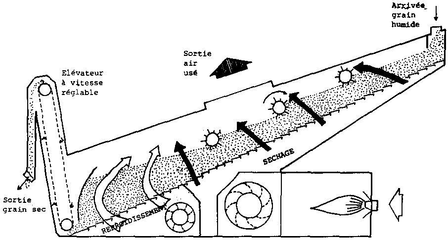 Le grain humide entre dans le séchoir par un orifice (trémie) équipé d'un dispositif automatique de régulation du débit. Dans un premier temps, il est réchauffe par de l'air humide ayant servi au refroidissement et recyclé pour employer la chaleur encore contenue par cet air. Le grain passe ensuite dans la zone de séchage où il est traversé par l'air chaud venant du générateur; enfin il passe dans la zone de refroidissement où il est traversé par un courant d'air ambiant.