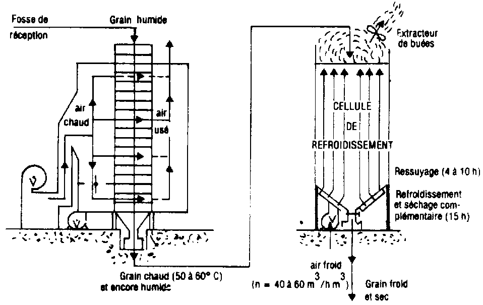Après le séchage, le refroidissement du grain ne s'effectue plus dans la partie basse du séchoir mais dans des cellules de refroidissement équipées d'un système de ventilation.
