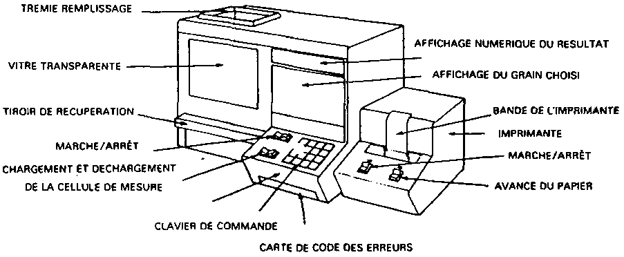 L'humidimètre comprend deux circuits à courant alternatif à relative haute fréquence (2 400 hertz). Sur l'un d'eux sont placés en série un condensateur fixe et un condensateur variable. Le condensateur fixe constitue la chambre de mesure, le grain jouant le rôle de l'isolant. L'introduction du grain provoque une modification de la fréquence du courant. L'équilibre est rétabli avec la fréquence du circuit de référence en agissant sur le condensateur variable. L'axe du condensateur porte un index qui, après étalonnage, permet la lecture directe du degré d'humidité sur un cadran.