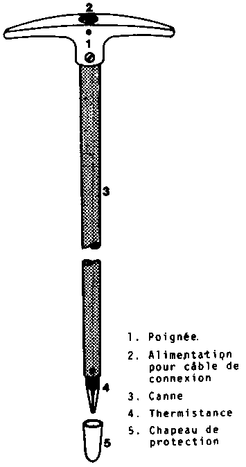 Le capteur de température se compose de la thermistance (sphère de 3 mm de diamètre en semi-conducteur par exemple) et de ses deux conducteurs de raccordement. Le tout est noyé dans une canne en fibre de verre de très grande rigidité mécanique (coefficient de rupture supérieur à plusieurs tonnes) et de faible diamètre (6 mm), ce qui permet d'enfoncer les sondes jusqu'à 4 m de profondeur sans effort particulier ou de les fixer au plafond avec des dispositifs d'ancrage simplifiés.
