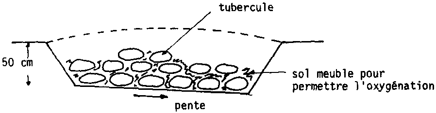 a) Les tubercules sont réunis en petits tas bien aérés recouverts de paille pour les protéger du rayonnement solaire direct. La conservation en Silo CLAMPS du type de ceux utilisés pour la pomme de terre peut aussi être envisagée.
