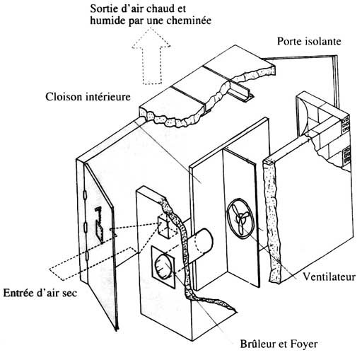 - d'une cloison intérieure en briques cuites permettant la circulation de l'air en boucle et délimitant 2 couloirs: 1 couloir dans lequel l'air est chauffé puis propulsé, et 1 couloir pouvant recevoir 2 chariots de 32 claies chacun pour le séchage des produits.
